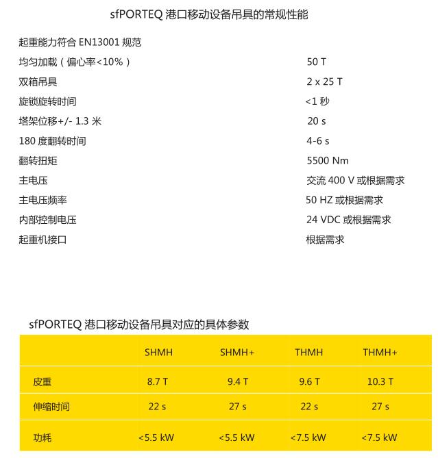 sfPORTEQ 港口移动设备吊具可满足坚固性和多功能性要求。适用于装卸 20 至 45 英尺以及2 x 20英尺的集装箱。该吊具采用成熟技术,满足应用场合所需的强度和耐用性。