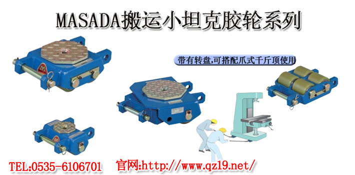 烟台天盈起重设备有限公司销售日本MASADA品牌:MASADA胶轮搬运坦克车,自重轻,结构紧凑,狭小空间可用,多用于机床、桥梁设备、建筑工程等行业的重物移运作业,更多,MASADA胶轮搬运坦克车详情可参考下列内容: