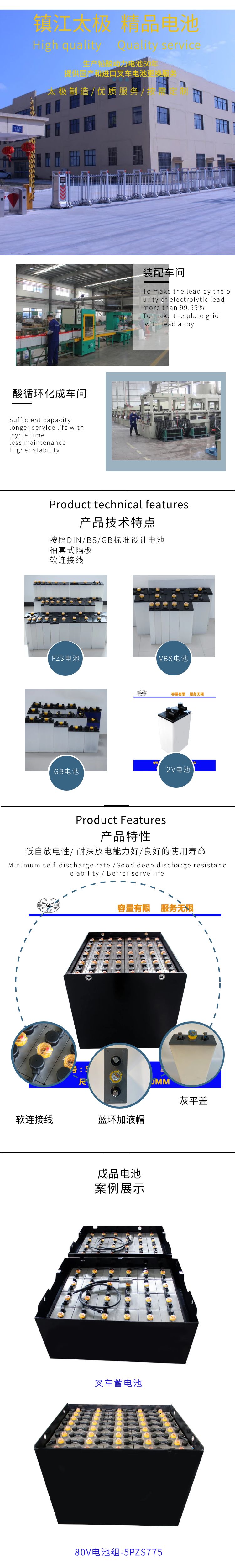 镇江太极电动车电源有限公司主要生产:英国标准VBS 158mm系列铅酸蓄电池,德国标准PZS 198mm系列铅酸蓄电池,广泛适用于各类电动叉车、电动堆高车、电动搬运车、电动牵引(机)车、电动游览观光车、电动高尔夫球车、电动清扫车、电动游船(艇)、电动汽车、电动三轮车等直流电源领域,具有容量大、寿命长、维护少、稳定可靠、外型美观等特点。