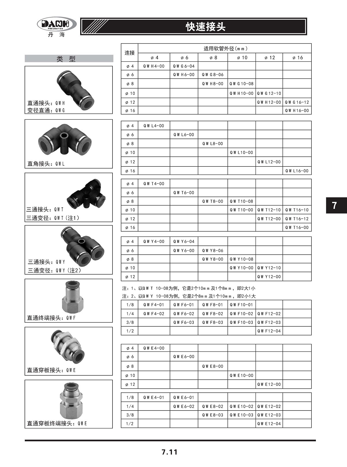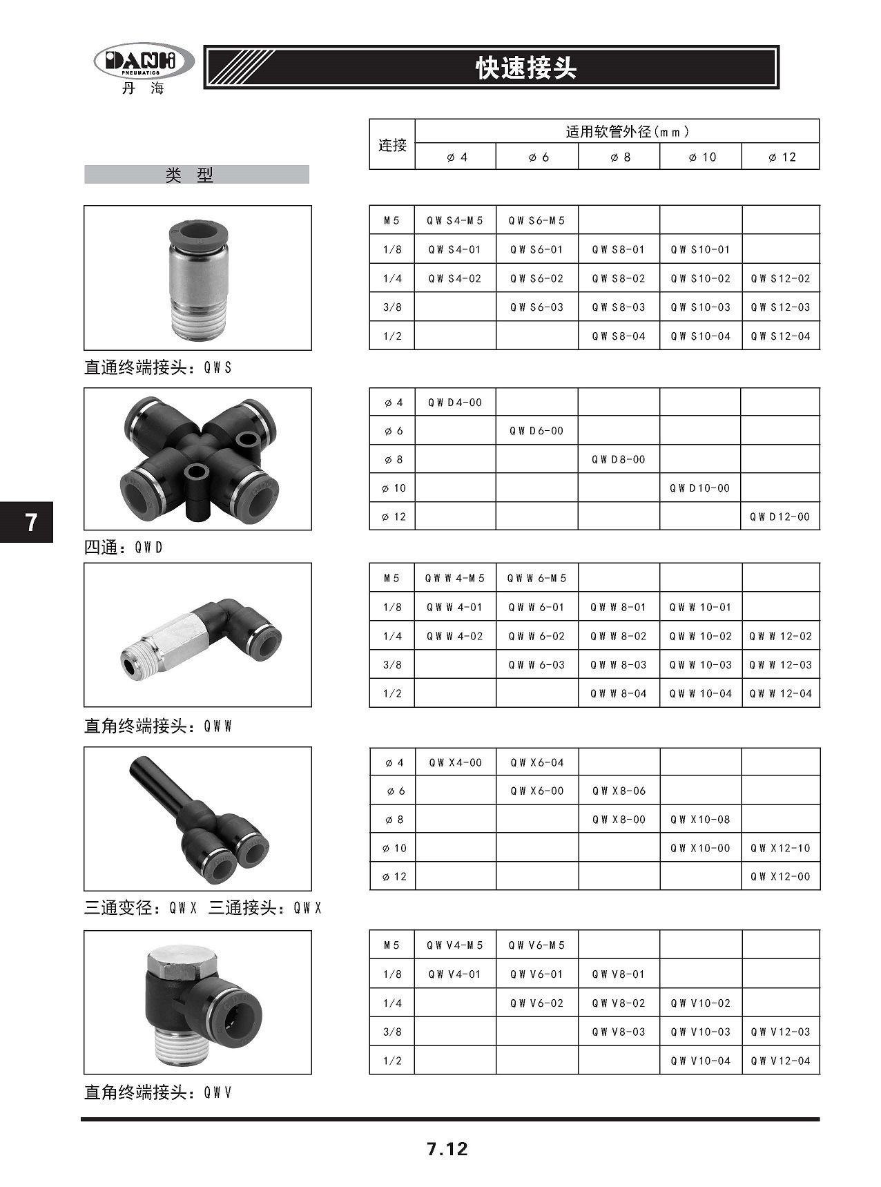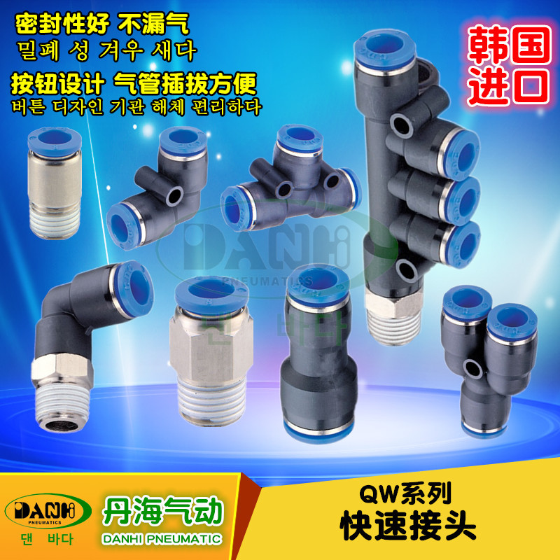 韩国DANHI丹海气动元件QW系列快速接头,快插接头,气动接头,气管快插接头,塑料快插接头,气嘴接头,快插气接头,气管卡盘接头,螺纹弯头,软管接头,铜接头,气缸接头,PU管接头,电磁阀接头,换向阀接头,QWH直通终端接头(QWH6-01、QWH6-02、QWH8-01、QWH8-02、QWH10-02、QWH10-03、QWH12-02、QWH12-03、QWH12-04、QWH16-03、QWH16-04),QWL直角终端接头(QWL6-01、QWL6-02、QWL8-01、QWL8-02、QWL10-02、QWL10-03、QWL12-02、QWL12-03、QWL12-04、QWL16-03、QWL16-04),QWT三通T型终端接头,QWY三通Y型终端接头,QWU三通接头,QWG直通变径接头(QWG6-04、QWG8-04、QWG8-06、QWG10-06、QWG10-08、QWG12-08、QWG12-10、QWG16-12),QWH直通等径接头(QWH4-00、QWH6-00、QWH8-00、QWH10-00、QWH12-00、QWH16-00),QWL直角等径接头(QWL4-00、QWL6-00、QWL8-00、QWL10-00、QWL12-00、QWL16-00),QWT三通T型等径接头(QWT4-00、QWT6-00、QWT8-00、QWT10-00、QWT12-00、QWT16-00),QWT三通T型变径接头,QWY三通Y型三通等径接头(QWY4-00、QWY6-00、QWY8-00、QWY10-00、QWY12-00),QWY三通Y型变径接头,QWF内螺纹直通终端接头(QWF6-01、QWF6-02、QWF8-02、QWF8-03、QWF10-02、QWF10-03、QWF10-04、QWF12-02、QWF12-03、QWF12-04),QWE穿板接头(QWE4-00、QWE6-00、QWE8-00、QWE10-00、QWE12-00),QWE内螺纹穿板接头,QWS内六角外圆直通接头,QWD四通等径接头(QWD4-00、QWD6-00、QWD8-00、QWD10-00、QWD12-00),QWW直角外螺纹加长终端接头,QWX三通接头,QWV直角外螺纹终端接头,QWM1快速接头汇流板,QWM2五通快速接头,QWM3五通变径接头。